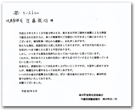 平成23年3月11日・東日本大震災で被災された岩手県鵜住居町内の方々に、我々有松まち普請の会を通じ、4月某日、支援金を寄贈させて頂きました事に対し、復興の準備で追われる毎日のはずですが、お礼状が届きました。